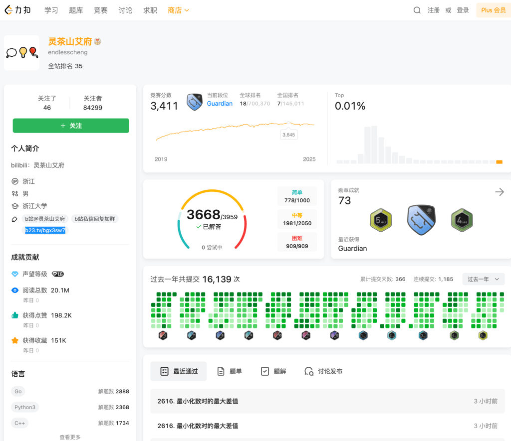 I’m currently working on improving my data structures and algorithms (DSA) skills by following the curated problem list created by the Bilibili content creator EndlessCheng (灵茶山艾府). He is globally ranked #18 in LeetCode Weekly Contests and consistently achieves AK (All Kill) — solving all problems in each contest, regardless of difficulty.
